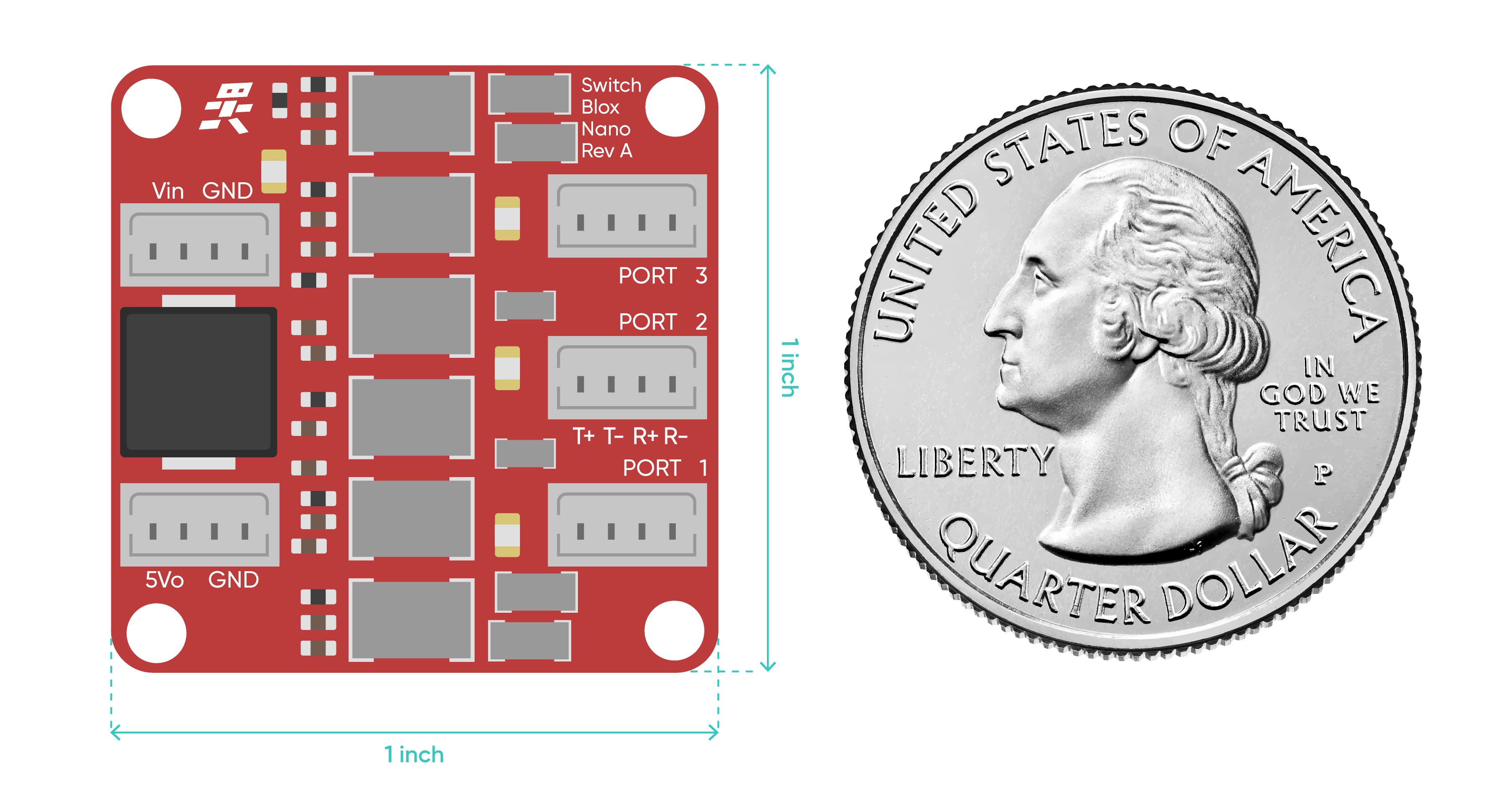 With an overall size of 25.5mm (1 inch) by 25.5mm (1 inch), SwitchBlox Nano is designed for truly space-constrained applications that need compact, robust ethernet connectivity.